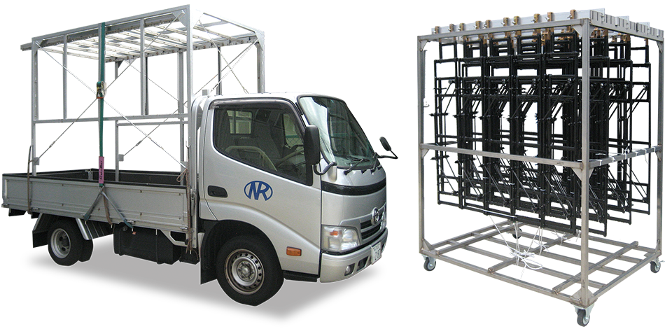 ラックを吊り下げる形で運搬するための専用架台は、いわばラックのためのラックです。めっき用ラックを知りつくした日本ラックだから、ラックの弱点を克服した専用架台の開発も可能になりました。専用架台は丈夫に、しかも軽く造られていて、トラックにラッシングすることで完全に固定できます。日本ラックに蓄積された経験とノウハウを活かした一例と言えるでしょう。